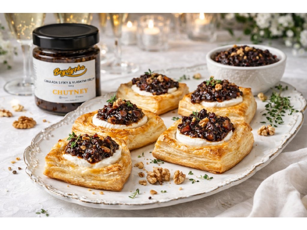 Mini koláčky z listového těsta naplň kozím sýrem a přidej lžičku cibulového čatní s fíky a ořechy BEYDYZKA. Peč dozlatova a podávej jako elegantní pohoštění nebo předkrm.