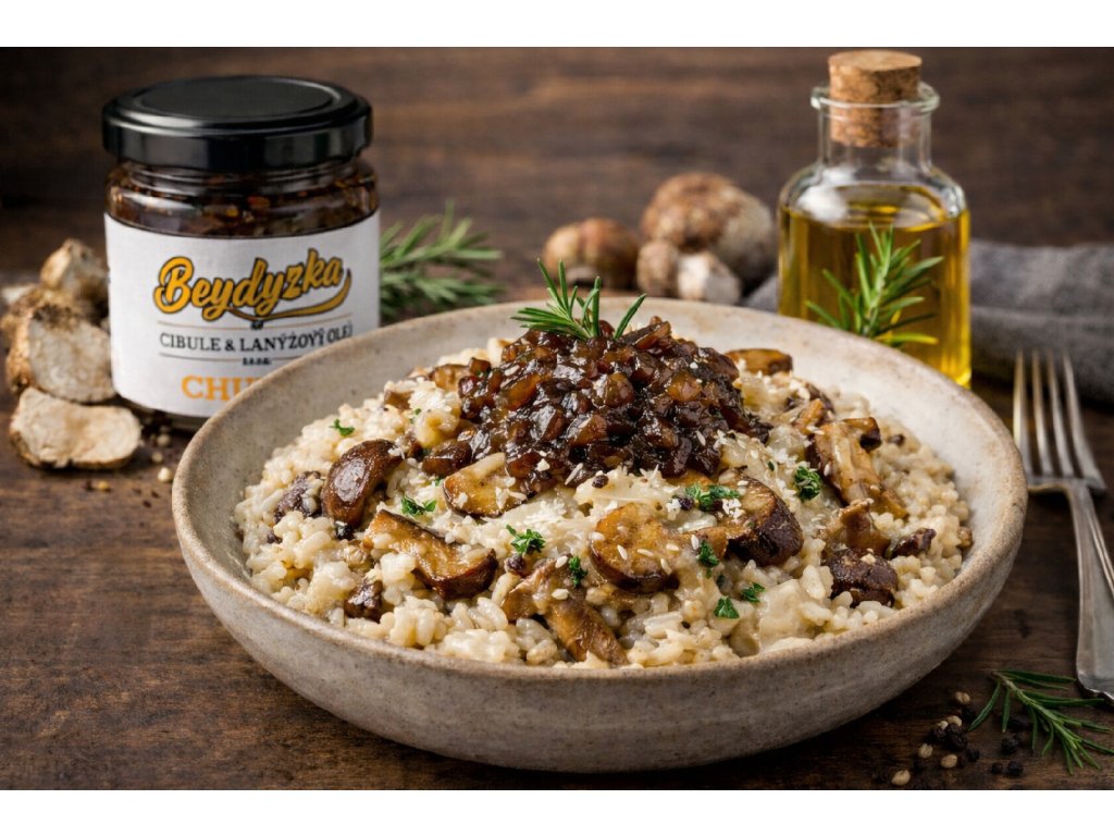 Krémové rizoto s lesními houbami doplňte lžičkou cibulového čatní s lanýžovým olejem BEYDYZKA, které zvýrazní zemitou chuť hub a dodá pokrmu hloubku.